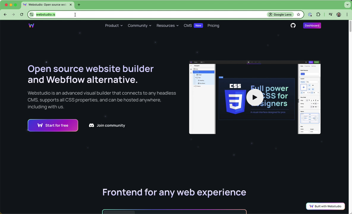 Begin by navigating to the Web Studio website at webstudio.is. Once there, click on the dashboard and log in.