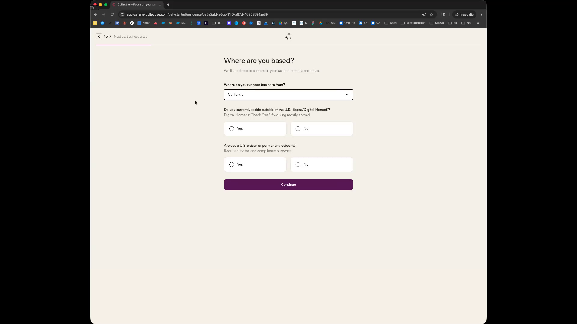 To personalize your experience, answer a series of basic questions. These include your location, residency status, and whether you're a digital nomad. For this guide, the example location is set to California, and the user is not a digital nomad and is a citizen.