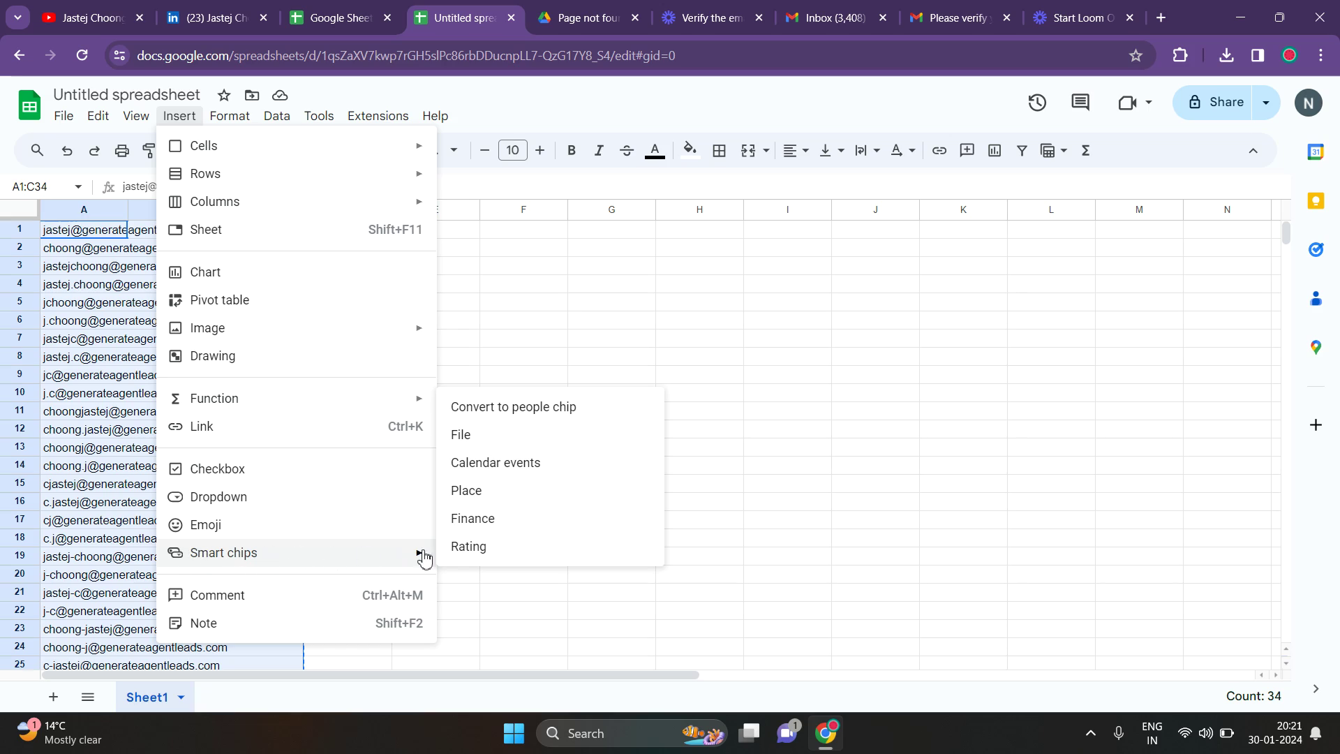 In the spreadsheet, navigate to the 'Insert' section and find the option to convert your list into 'People Chips'. This feature helps in highlighting the valid email address among the generated list.