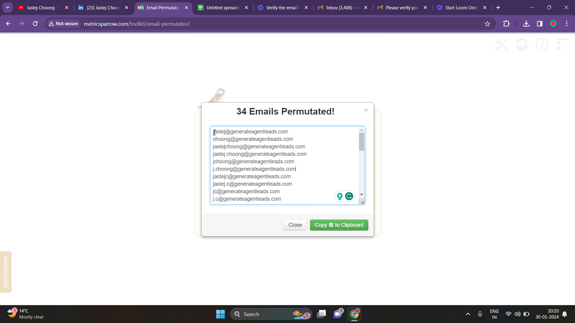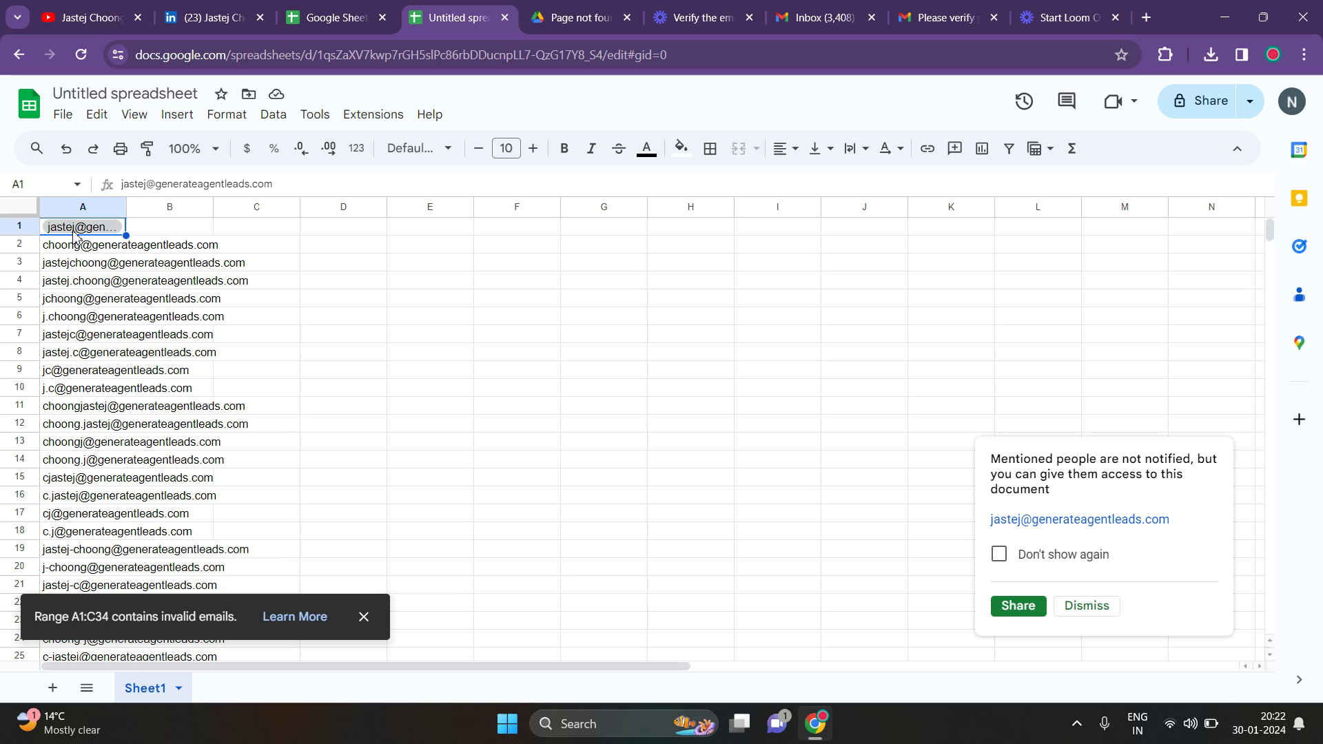 Copy the list of generated email addresses and paste them into a new spreadsheet. This will enable you to utilize spreadsheet tools to identify the valid email address.