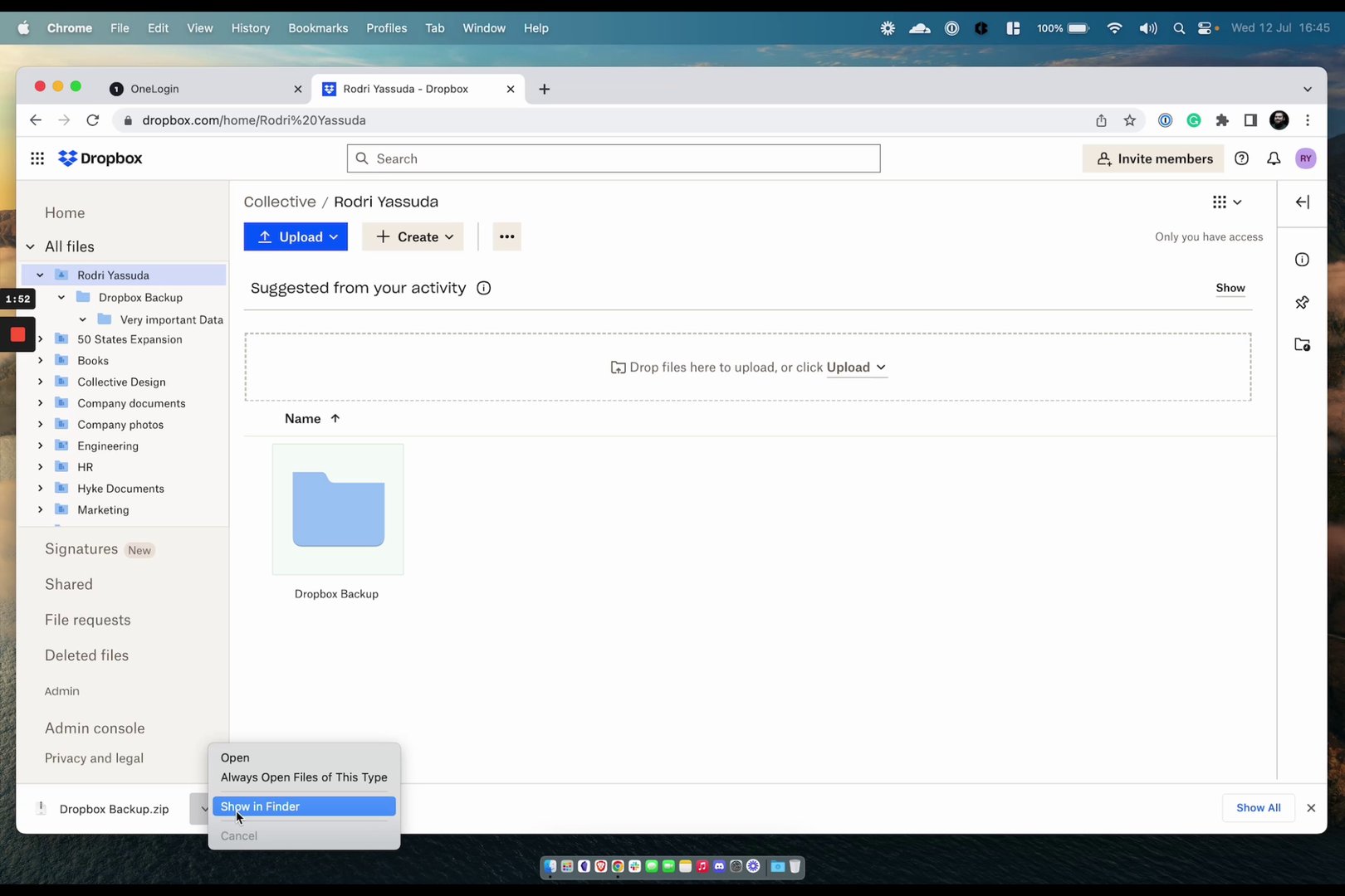 To begin, access your Dropbox account through the OneLogin portal.