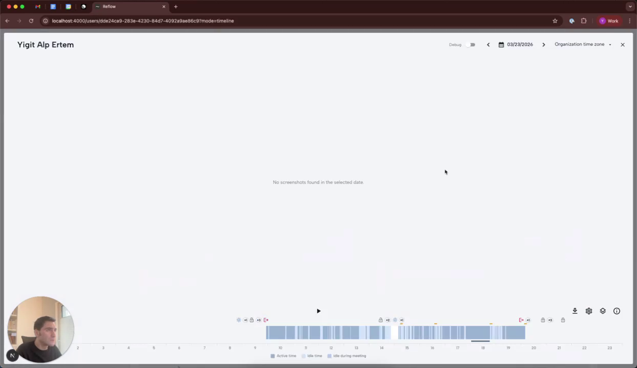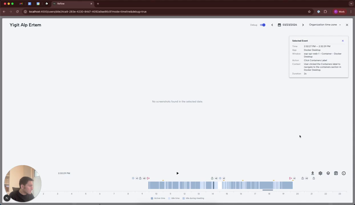 For a more detailed view, enable the debug mode. Hovering over events will now trigger a pop-up in the top right corner, displaying the selected event details.