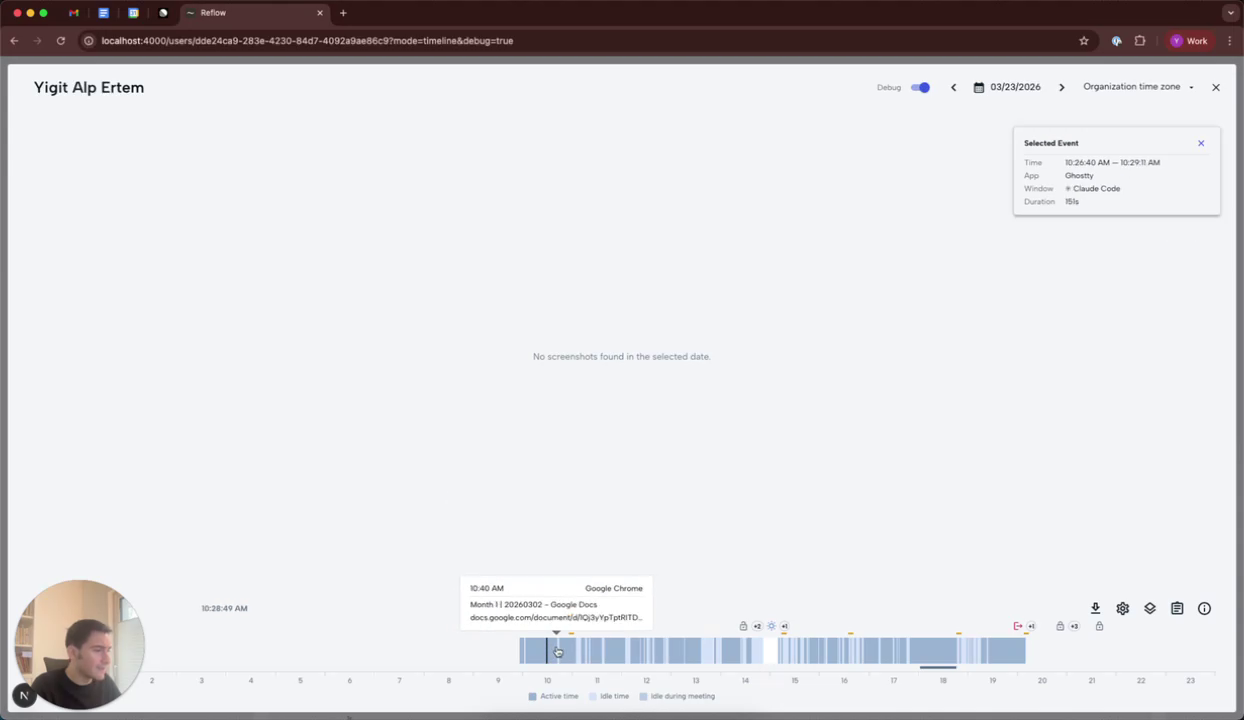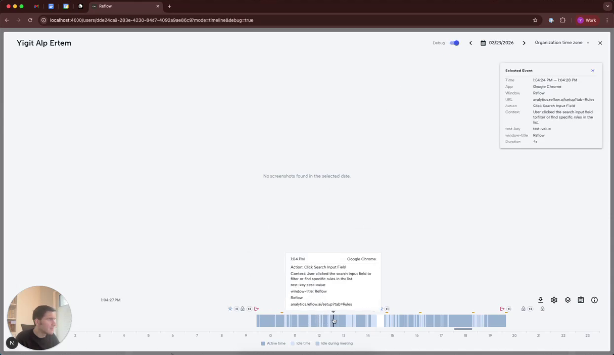 Hover over the events on the timeline to see their details. By enabling the debug mode, you can click on an event to open a selected event pop-up in the top right corner, which provides additional details about the event.
